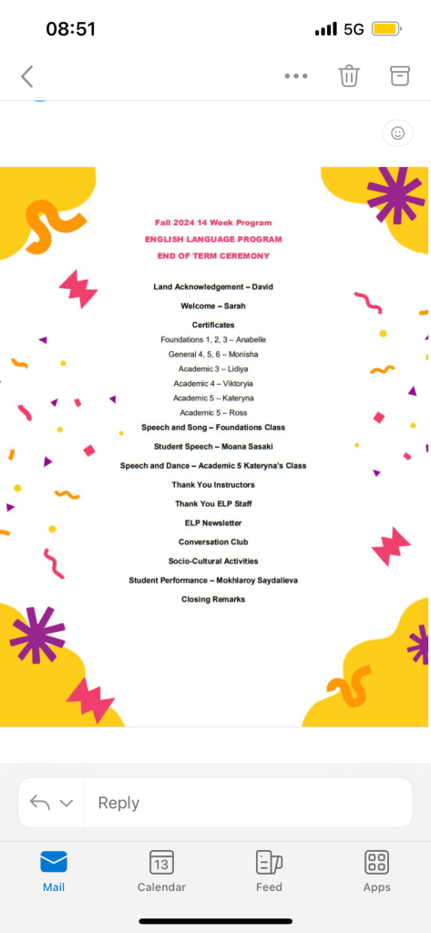 I saw a play in the university at night with Yuwon and Ivy. The play was about 2 hours and all English of course. I could understand all of the contents. So in this day I got a confidence about listening English. Some one cried after watching this play. Heartfull❤︎
